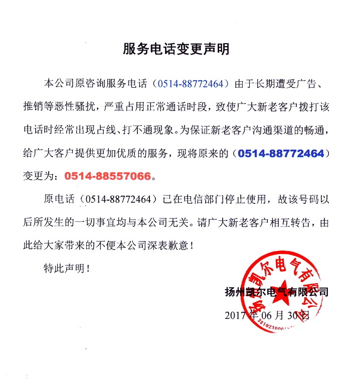 揚(yáng)州凱爾電氣咨詢服務(wù)電話變更聲明